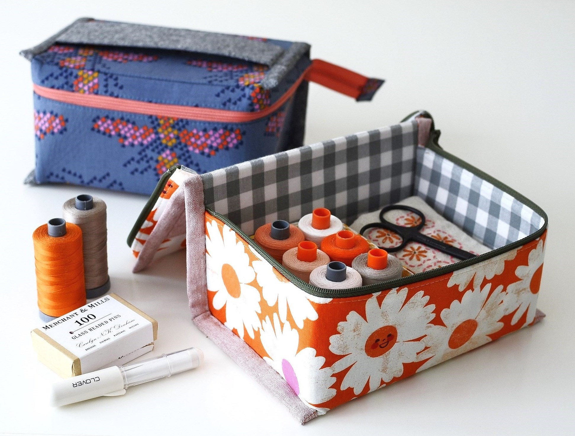 I used up some of the new Ruby Star Society fabric lines for these samples. For the top one (with the bird pincushion) I used a mix of Social and Spark by Melody Miller, Speckled by Rashida Coleman Hale and Add It Up by Alexia Marcelle Abegg. I used all Anagram and Grid fabrics by Kimberly Kight for the bottom one.