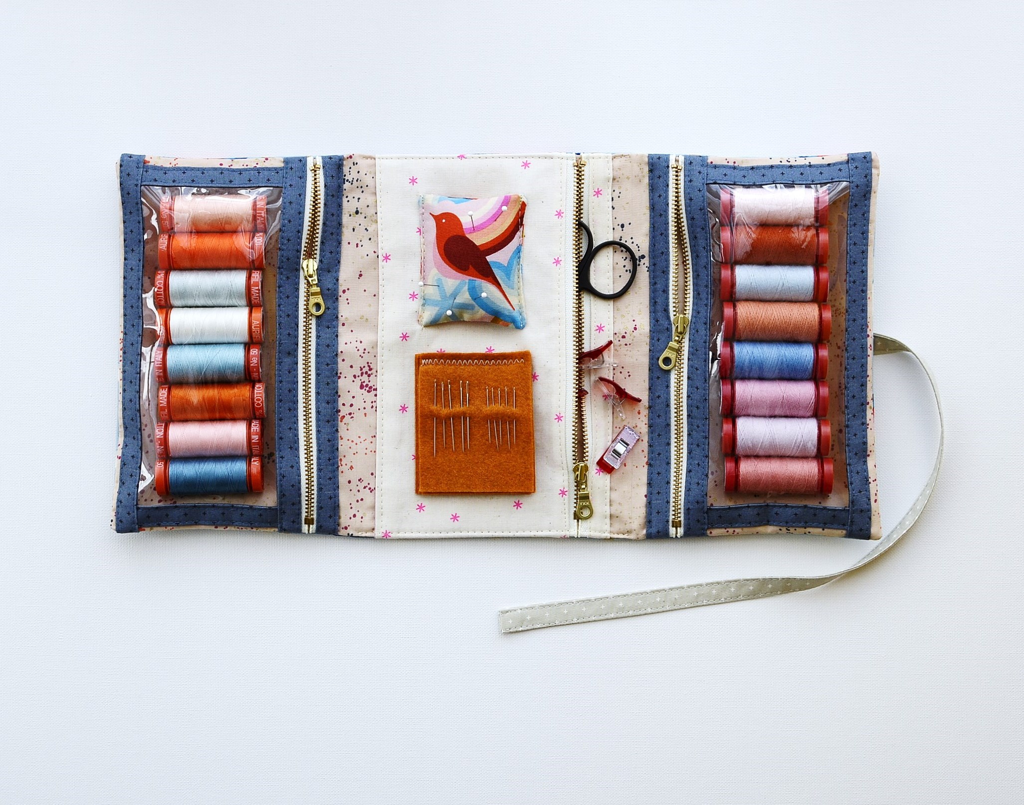 I made up a couple of samples that I think fit this bill perfectly. The Make And Go Pouch is a simple design which has three zippered pockets. Two of these are clear vinyl for maximum visibility of contents. There are also a handy pincushion and needle pages attached. I decided to keep all pockets zippered because although slip pockets look useful on this type of pouch, in practice they don't keep contents secure when opening and closing. Items can fly out easily and when those items are seam rippers and scissors, you don't really want that happening.